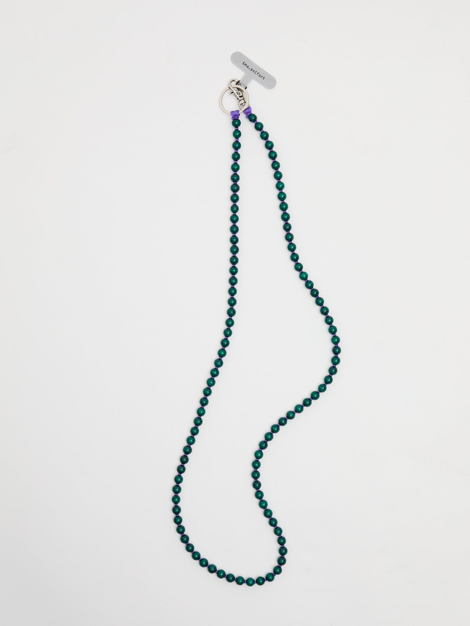 Phone necklace with elastic band and threaded wooden beads. Comes with adapter. The adapter can be used to connect our phone necklaces to any phone case size and model.